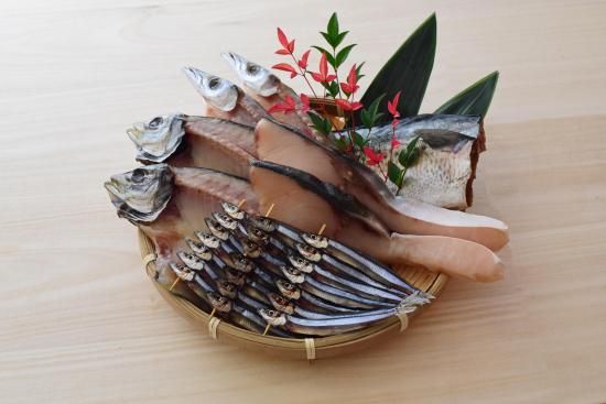 [セット内容]たい塩干し(2~3切)x1・ぶり塩干し(2〜3切)x1、ぶりみりん(2〜3切)×1、かますの干物(1枚)×3, 剣先するめ(1枚)、うるめ丸干し(1袋)×1、あじみりん(3~5枚)x1、たい塩麹漬けx1