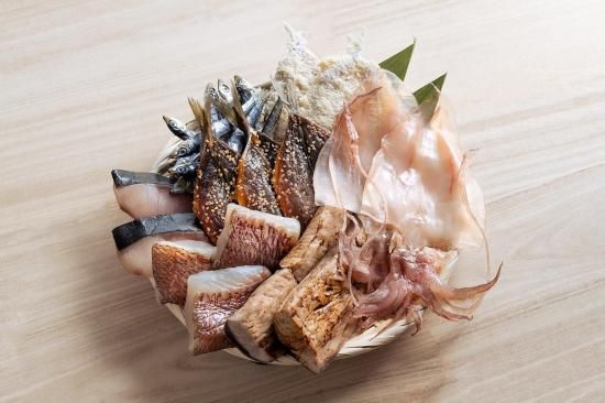 ぶりのたたき180g(タレ付き)×2、たいの干物(2〜3切)×1、うるめ丸干し60g×1、あじふらい(1枚)×2、ぶりの干物(2切)×1、剣先するめ1枚×2、あじみりん(2〜3切)×1