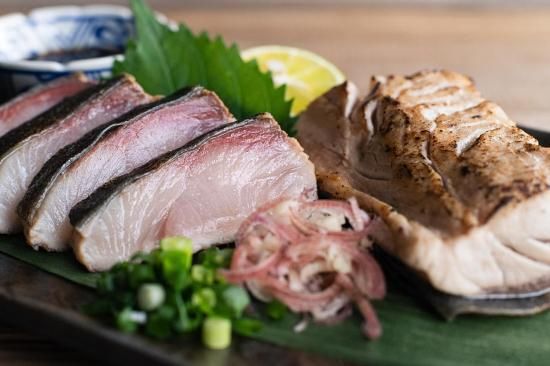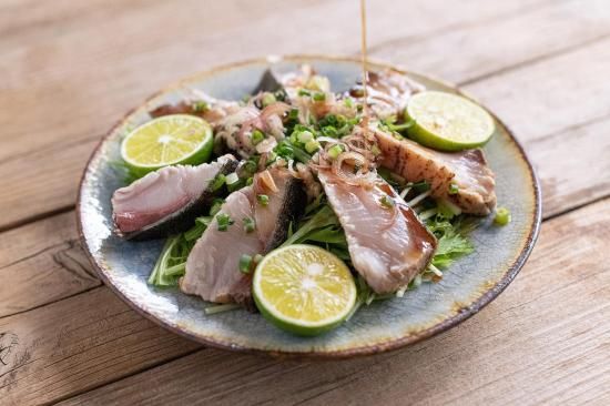脂のり抜群のブリに、旬の新玉ねぎやネギ、ニンニクなどの薬味を添えてお召し上がりください。当店特製の土佐酢タレとの相性抜群です。